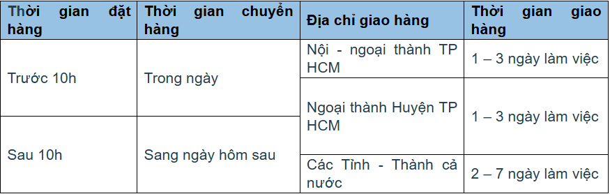 – Thứ hai đến hết ngày Thứ bảy hàng tuần, không Giao hàng vào Chủ nhật và ngày Lễ.